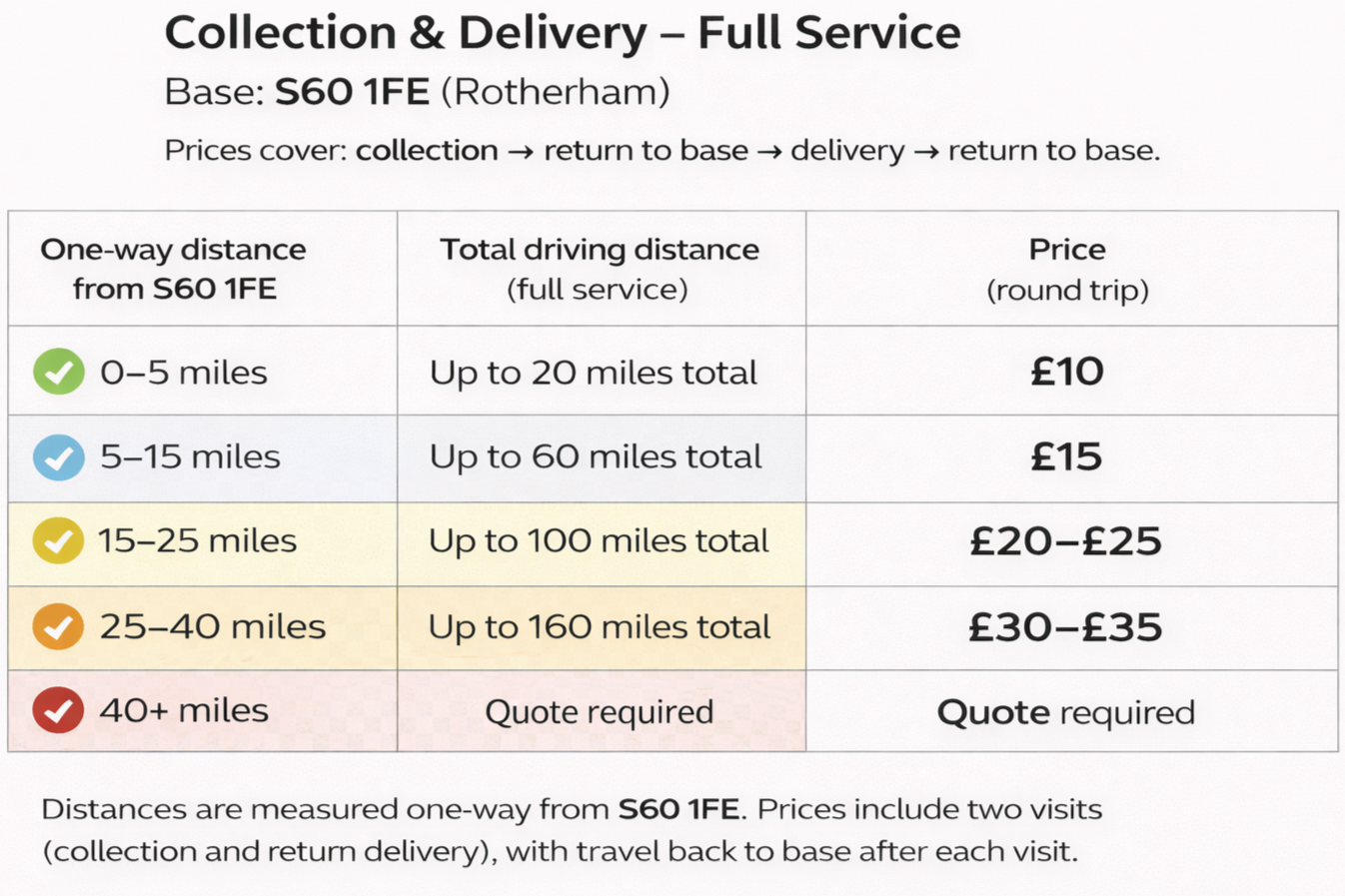 Collection and delivery pricing is based on distance from our base and includes both pickup and return. Any final cost will be confirmed once you progress with your enquiry, so there are no surprises.